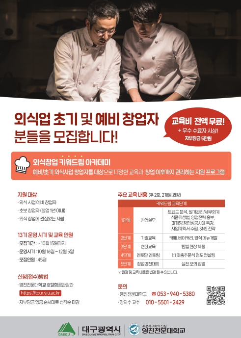 노권율 대구광역시 위생정책과장은 “외식 분야는 어려운 영업환경 속에서 준비된 자만이 살아남을 수 있는 시장”이라며, “키워드림 아카데미는 외식 창업에 도전하는 예비 창업자들에게 맞춤형 교육과 체계적인 사후관리로 차별화된 경쟁력을 확보하고 지속 가능한 발전을 이끌어갈 것”이라고 말했다.