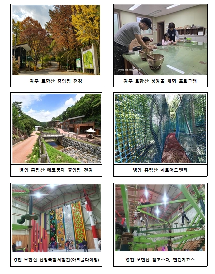 상주 성주봉자연휴양림은 가족들이 자연과 목재를 직접 접하며 특별한 추억을 쌓을 수 있는 목공예 체험과 숲 해설 프로그램, 경주 토함산자연휴양림은 싱잉 볼 체험, 목공예 체험·목재 놀이 등 다채로운 프로그램이, 영천 보현산자연휴양림은 산림 레포츠, 명상 치유, 목공예 체험 등 다양한 활동이 마련되어 있다.