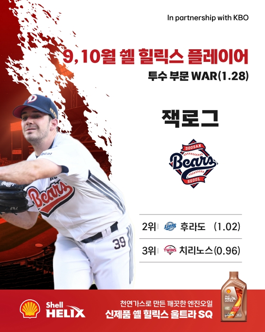 ‘쉘힐릭스플레이어’는 WAR(대체 선수 대비 승리 기여도)를 기준으로 선정하며, 9-10월 투수 부문에서는 두산 잭로그가 WAR 1.28로 1위를 차지했다. 잭로그는 9-10월 동안 총 25이닝(공동 6위)을 소화하며 평균자책점 1.08(1위), WHIP 0.92(4위)를 기록했다. 삼진 또한 27개(공동 7위) 잡아내는 등 안정적인 경기 운영과 강력한 구위를 선보이며 올 시즌 마지막 ‘쉘힐릭스플레이어’ 투수 부문 수상의 영예를 안았다.