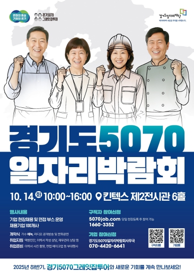 한편 이번 박람회는 ‘경기 5070 그레잇잡투어’ 사업의 하나로 진행된다. ‘경기 5070 그레잇잡투어’는 인구구조 변화와 중장년 구직 수요 증가에 대응해 재취업 지원과 상시 채용 환경 조성을 위한 50~70대 중장년 특화 일자리박람회로, 7월부터 12월까지 남·북부 광역박람회 및 시군별 지역박람회를 추진중이다.