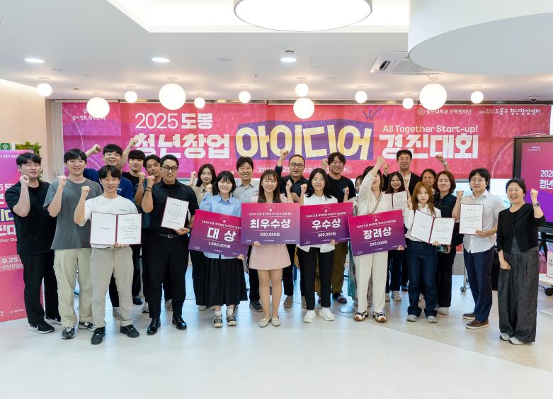 ![]() 도봉구 청년창업센터 경진대회 수상자와 참여자들이 단체 사진을 찍고 있다 |