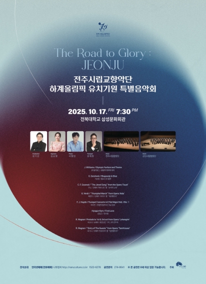 전주시립교향악단은 오는 17일 오후 7시 30분, 전북대학교 삼성문화회관에서 시민과 지역사회가 함께 올림픽 유치의 뜻을 나누는 특별음악회 ‘The Road to Glory: Jeonju’를 개최한다.