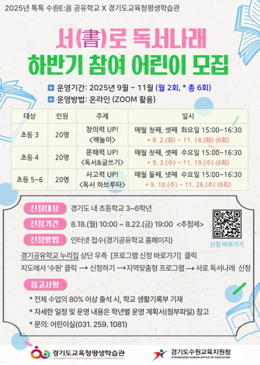 9월부터 11월까지 온라인으로 운영되는 ‘서(書)로 독서나래’는 다양한 독서 활동을 통해 독서의 흥미를 높이고 또래 친구들과 생각을 공유하며 공감 능력, 비판적 사고력 등을 키울 수 있는 프로그램이다.