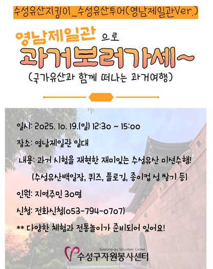 이번 프로그램은 수성구의 대표적 국가유산인 영남제일관에서 조선시대 과거시험을 재현한 체험형 역사·문화 프로그램으로, 주민들에게 전통문화를 쉽고 재미있게 접할 기회를 제공한다. 참가자들은 ▲수성유산 백일장 ▲퀴즈 ▲플로깅 ▲종이컵 성 쌓기 등 다양한 프로그램을 통해 옛 선비들의 과거시험을 체험할 수 있다.