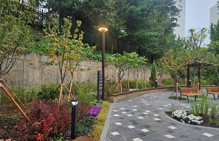 새롭게 조성된 쉼터에는 산딸나무, 문그로우 등 수목 705주와 초화류 3,130본이 식재돼 사계절 변화를 느낄 수 있는 작은 정원 형태를 갖췄다. 또, 아이들과 어르신들도 잠시 쉬어가며 힐링할 수 있도록 벤치, 퍼걸러 등 편의시설을 설치하고, 주변에는 조명을 더해 야간에도 안전하게 이용할 수 있도록 했다.