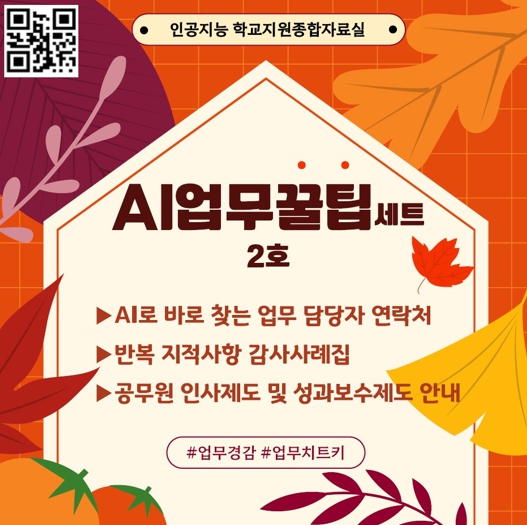 이번에 공개된 AI 업무꿀팁세트 2호는 교육 현장에서 자주 문의 되는 행정 절차와 반복적으로 발생하는 오류를 예방하기 위한 실무형 지원 자료로 구성됐다. 주요 내용은 △AI로 바로 찾는 업무 담당자 연락처 △반복 지적사항 감사사례집 △공무원 인사제도 및 성과 보수제도 안내 등이다.
