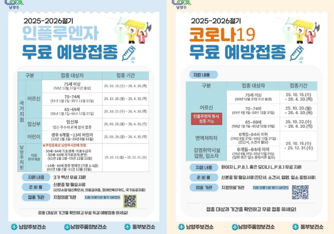 ![]() 남양주시, ‘2025-2026절기 코로나19·인플루엔자 무료 예방접종’ 실시 |