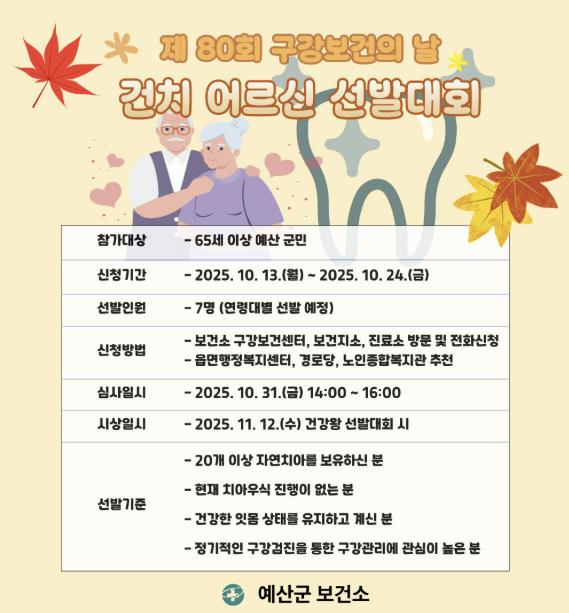 대회 참가 접수 기간은 10월 13일부터 24일까지며, 보건소 구강보건센터로 전화 또는 방문 신청이 가능하고, 관할 보건지소 및 진료소에서도 신청할 수 있다.