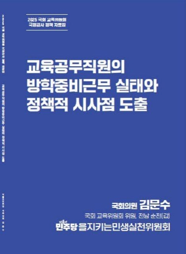 국회 교육위원회 소속 더불어민주당 김문수 의원(전남 순천갑)은 더불어민주당 을지로위원회의 의뢰로 작성된 '교육공무직원의 방학중비근무 실태와 정책적 시사점 도출' 보고서를 통해, 방학 중 급식노동자 등 비근무자의 경제적 불안정이 구조적으로 고착화되고 있음을 확인했다고 밝혔다.