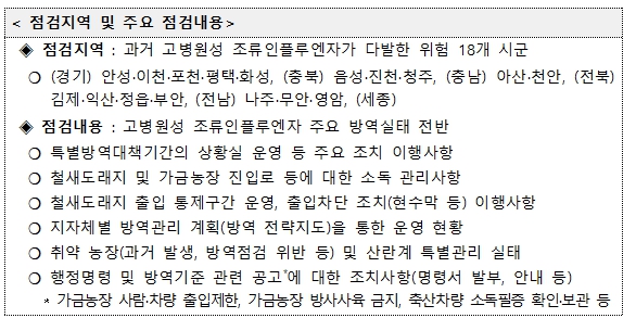 이번 점검은 지난 9월 12일 경기도 파주에서 과거보다 다소 이른 시기에 고병원성 조류인플루엔자가 가금농장에서 발생했고, 10월부터 겨울 철새가 본격 도래하면서 국내 추가 발생 가능성이 높아짐에 따라 선제적으로 농식품부, 행정안전부, 농림축산검역본부, 시도 관계관 합동으로 점검반을 구성하여 실시하는 것이다.