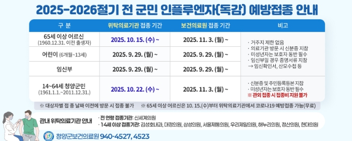 ![]() ‘2025-2026절기 전 군민 인플루엔자 무료 예방접종’ 일정 |