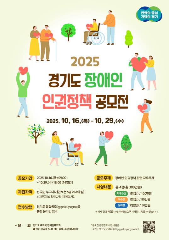 최선숙 경기도 장애인복지과장은 “이번 공모전을 통해 다양한 정책 아이디어를 발굴하고 장애인 권리 증진 및 차별 해소에 실질적으로 기여하길 기대한다”면서 “관심 있는 분들의 적극적인 참여를 기다린다”고 말했다.