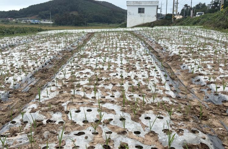 ![]() 정식 후 지속적인 강우로 발아가 잘 되지 않은 태안 마늘밭 모습(2025. 10. 10.). |
