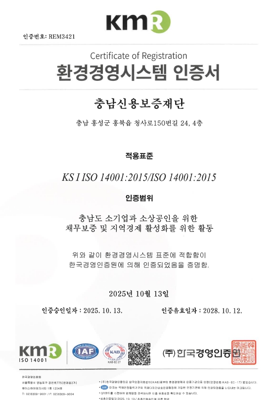 ![]() 충남신보, ISO 14001(환경경영시스템) 인증 취득 |