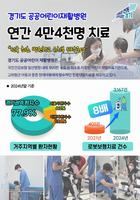 국민건강보험 일산병원 내에 마련된 경기도 공공어린이재활병원은 수도권 최초로 지정된 어린이 재활의료기관으로, 고위험군 아동과 중증 장애아동에게 필수적인 집중재활치료를 제공하고 있다. 특히 지역사회 기반 어린이 재활의료체계를 구축해, 아동과 가족이 거주지에서 단절 없는 재활치료를 받을 수 있는 기반을 마련했다.