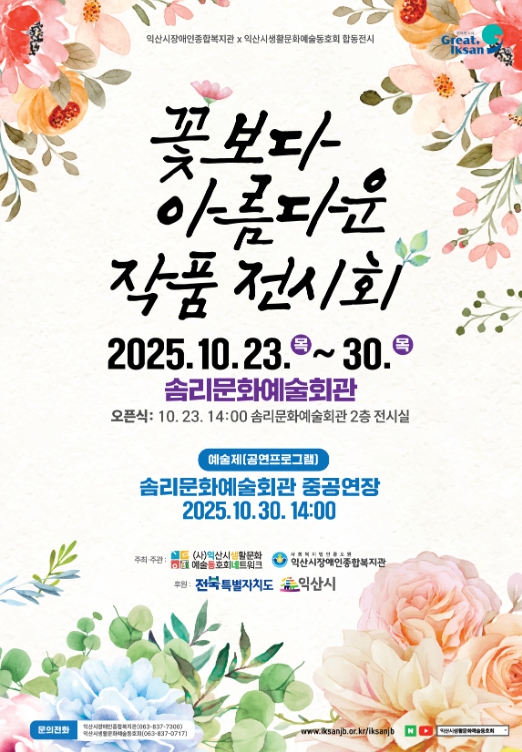 익산시는 오는 23일부터 30일까지 솜리문화예술회관 전시실에서 '2025 꽃보다 아름다운 작품전시회'가 열린다고 20일 밝혔다.