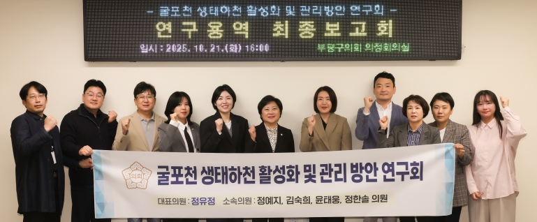 정유정 대표의원(부평3, 산곡3‧4, 십정1‧2)은 “굴포천 복원 사업은 외적 완성뿐만 아니라 지속 가능한 관리와 적극적인 주민 참여를 통한 활성화가 핵심이라는 점을 확인했으며, 특히 연구용역을 통해 오염관리 및 생태네트워크 유지를 위한 시민 참여형 사후관리 시스템 구축 방안을 구체화했다”라며, “이번 연구용역 결과를 바탕으로 체계적인 사후관리 및 활성화 로드맵을 구축하고 이를 부평구 정책에 반영할 수 있도록 적극 노력하여 굴포천이 친수공간으로 역할을 다할 수 있도록 하겠다”라고 밝혔다.