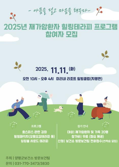 ![]() 양평군, 재가암환자 '힐링테라피 프로그램' 참여자 모집 |