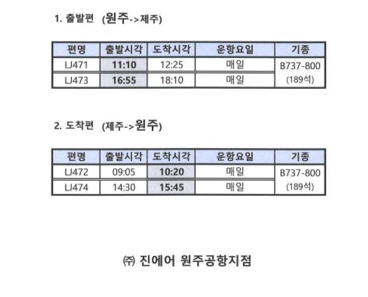원주공항에 취항한 진에어의 동계 항공기 운항 일정이 국토교통부 최종 승인으로 확정됨에 따라, 10월 26일부터 원주공항에서 출발하는 제주행 항공편은 기존 오전 11시 10분·오후 5시 20분에서 오전 11시 10분·오후 4시 55분으로 변경된다.