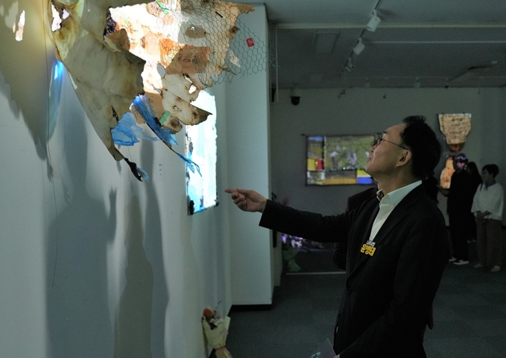 ![]() 윤병태 시장이 지난 23일 ‘미디어아트×분리배출 REVISION’ 전시회를 찾아 작품들을 관람하고 있다. |