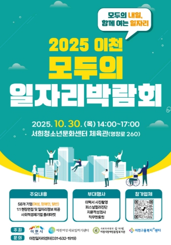 이천시 관계자는 “이번 박람회는 여성, 장애인, 일반 구직자가 함께 어우러지는 통합형 일자리 행사로, 지역 기업의 인력난 해소와 시민의 취업 기회 확대라는 두 가지 목표를 동시에 실현할 것”이라며“많은 시민이 참여해 원하는 일자리를 찾는 기회가 되길 바란다”라고 말했다.