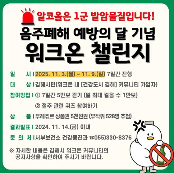 ![]() 김해서부보건소, 11월 ‘음주폐해 예방의 달’ 맞이 걷기 챌린지 운영 |