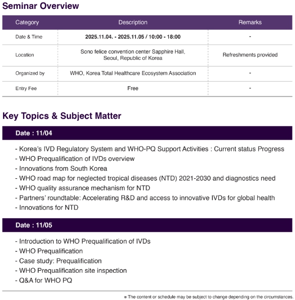 세미나에서는 WHO의 PQ 제도 개요와 평가 절차 소개 및 PQ 인증에 필요한 자료 요건과 실제 심사 사례 발표, 식약처의 국내 기업 대상 WHO-PQ 인증 지원 사업 안내 등을 통해 우리 기업의 WHO PQ 제도 이해를 돕는다. 또한 PQ 인증을 준비하는 체외진단의료기기 제조기업과 WHO 담당자 간 1:1 맞춤형 상담 세션도 함께 진행된다.