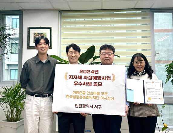 이번 수상은 지역주민, 유관기관, 단체 등이 함께 참여한 생명존중 안심마을 조성사업이 지역 내 자살예방 환경 조성에 기여한 공로를 인정받은 결과로, 서구는 2025년 8개 동을 인천 최대 규모의 생명존중 안심마을 조성하여 운영하고 있다.