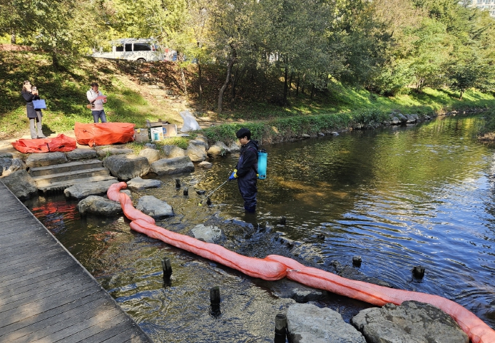 이번 훈련은 탱크로리 차량의 전복사고로 유류가 장수천에 유입된 상황을 가상하여 진행됐다.