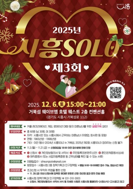 행사는 오는 12월 6일 오후 3시부터 9시까지 시흥 거북섬 웨이브엠 호텔 웨스트 2층 컨벤션홀에서 열린다. 참가 대상은 시흥시민 또는 시흥시에서 근무하는 1983~1998년생 미혼남녀 60명(남자 30명ㆍ여자 30명)이다.