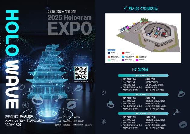 ‘미래를 밝히는 빛의 물결, HOLO WAVE’를 주제로 하는 이번 엑스포는 전북특별자치도와 익산시가 그동안 추진해온 홀로그램 산업 육성 성과를 도민과 공유하고, 문화·기술·산업이 융합된 새로운 홀로그램 산업 비전을 제시하는 자리로 이를 통해 홀로그램 도시, 익산의 위상을 전국적으로 알릴 예정이다.