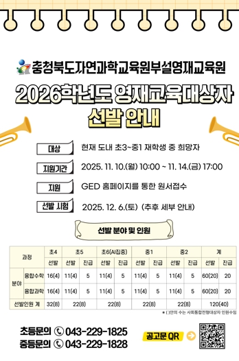 지성훈 자연과학교육원장은 “2026학년도에도 학생들의 영재성을 신장하기 위한 다양한 영재교육 프로그램을 계획하고 있다.”라며, “충북 도내의 영재교육에 관심 있는 학생들이 많이 지원하길 바란다.”라고 말했다.