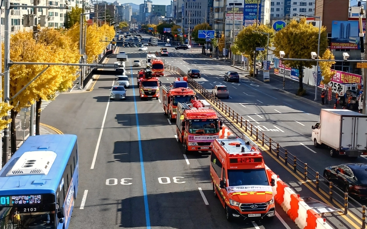 소방차 7대가 ‘불조심 강조의 달’ 홍보 플래카드를 부착하고 주요 도로를 행진하며 겨울철 화재 예방 메시지를 전했다.