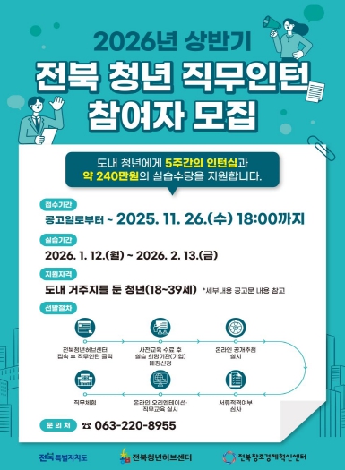 참여 신청은 전북 청년 직무인턴 공식 누리집을 통해 온라인으로만 가능하다.