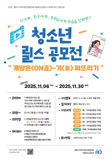 계양구지역사회보장협의체 관계자는 “이번 공모전을 통해 청소년들이 서로에게 전하는 따뜻한 메시지가 지역사회 전반으로 확산되기를 기대한다.”라며 “많은 청소년의 관심과 참여를 바란다.”라고 전했다.