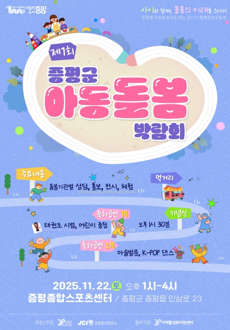 행사는 식전 공연을 시작으로 개회식에서는 아동돌봄 비전선포 퍼포먼스가 진행돼 증평군이 추진할 아동돌봄 정책의 비전과 방향을 공유한다.