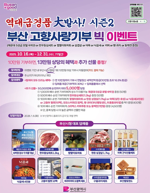 아울러, 기부자 모두에게 제공되는 답례품 외에도 경품 행사를 통해 해운대 5성급 호텔 숙박권, 한우등심세트 등을 제공한다.