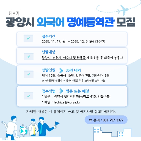 ![]() 광양시, 국제교류 지원할 ‘제8기 외국어 명예통역관’ 35명 모집 - 철강항만과(명예통역관 모집 카드뉴스) |