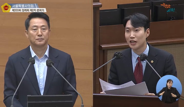 ![]() 시정질문 중인 김규남 서울시의원(우)과 오세훈 서울시장(좌) |