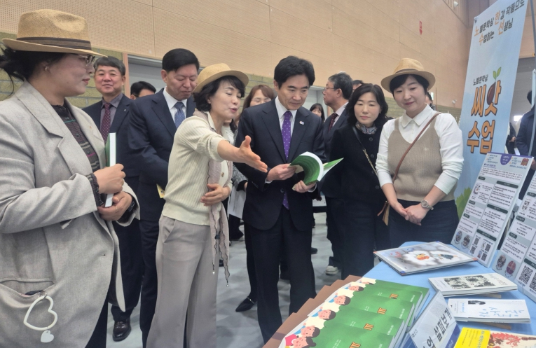 ![]() 김대중 전남교육감이 22일 열린 ‘2030 유‧초등 수업한마당’에 선보인 ‘노벨문학상 씨앗수업’을 살펴보고 있다. |