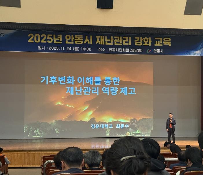 이번 교육은 재난․안전 분야 전문가인 경운대학교 최문수 교수를 초빙해 진행됐다. 최 교수는 최근 기후위기와 연계된 재난 발생 동향을 설명하고, △집중호우․대형 산불 등 재난 유형별 대응 요령 △재난 발생 시 초동조치 및 상황전파 체계 등을 중심으로 강의를 이어갔다.
