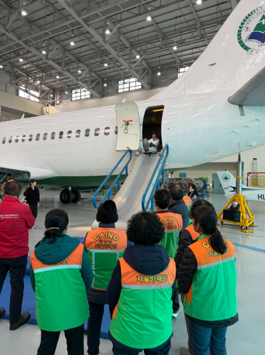 ![]() 청양군 지역자율방재단 단원들이 한서대학교 재난안전교육원에서 항공기 비상탈출 체험교육을 받으며 실제 상황에 대비한 안전훈련을 실시하고 있다 |