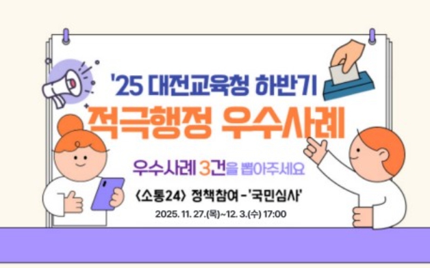 대전시교육청 이차원 감사관은 “온라인 국민심사에 많은 관심과 참여를 부탁 드린다”며 “국민 한 분 한 분의 참여가 더 나은 행정을 만드는 밑거름이 되니, 적극적으로 업무를 추진한 공무원들의 사례를 확인하시고 소중한 의견을 보태주시기 바란다”라고 밝혔다.