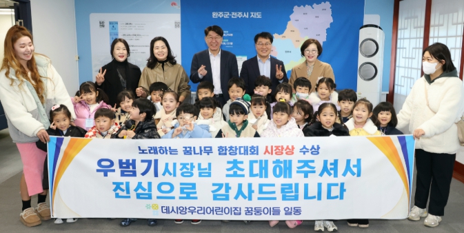 우범기 전주시장과 어린이집 원아들의 이번 만남은 지난달 23일 한동문화예술단이 주최한 ‘제4회 노래하는 꿈나무 합창경연대회’에서 시장상을 받은 데시앙우리어린이집 원아들을 축하하기 위해 마련됐다.