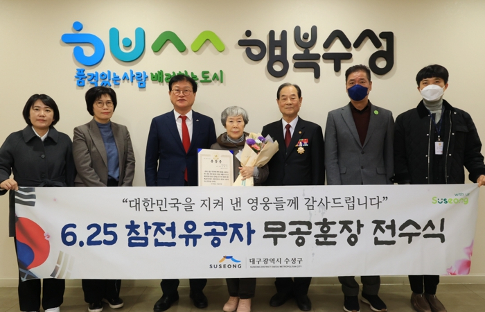![]() 대구 수성구는 지난 28일 6·25전쟁에 참전해 공을 세운 故 우희진 일병의 유가족에게 화랑무공훈장과 증서를 전수했다. |