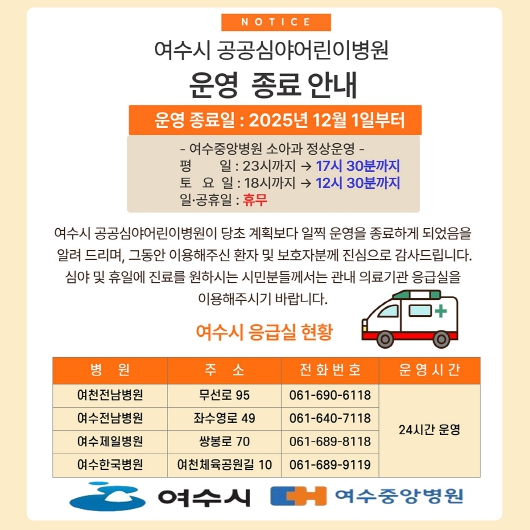![]() 여수시 공공심야어린이병원 운영 종료 안내문 |