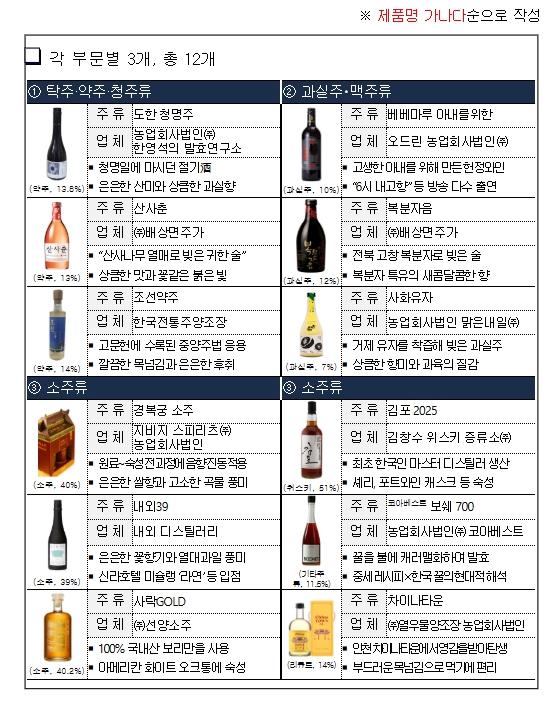 12개 제품은 공개 모집으로 선정된 국민심사단 40명을 비롯해 주류 전문가, 대기업 등 수출실무자, 인플루언서, 국세청 출입기자 등 다양한 분야의 인사들이 참여해 “세계인에게 소개하고 싶은 우리 술”이라는 가치를 중점으로 평가・선정됐다.