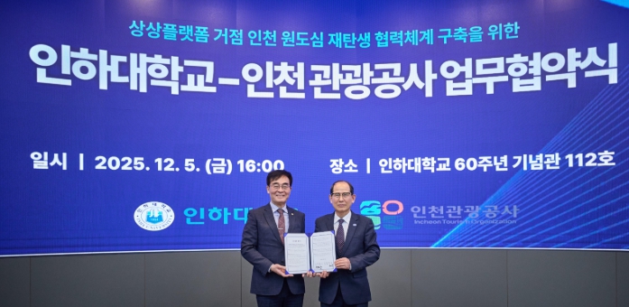 ![]() 인하대학교-인천관광공사 업무 협약식 (왼쪽부터) 인하대학교 조명우 총장, 인천관광공사 유지상 사장 |
