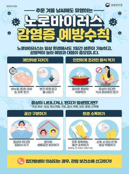 질병관리청 표본감시 결과에 따르면 최근 4주간 병원급 의료기관에서 확인된 노로바이러스 감염 환자는 45주 70명에서 46주 94명, 47주 101명, 48주 127명으로 지속적인 증가세를 보이며 주의가 필요한 상황이다.