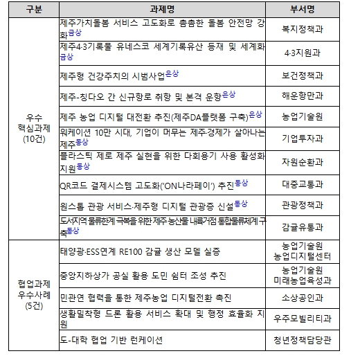 이 가운데 상위 5개 과제가 이날 발표 심사를 거쳐 최종 순위를 가렸으며, ‘제주4·3기록물 유네스코 세계기록유산 등재 및 세계화’와 ‘제주가치돌봄 서비스 고도화로 촘촘한 돌봄 안전망 강화’ 과제가 금상을 차지했다.